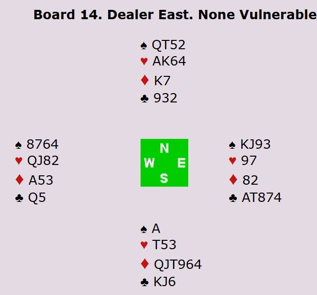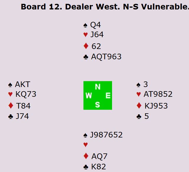 Alle fire Ø/V-parene var i 6 hjerter. Tre av dem fikk kontrakten på vest sin hånd, og det var mer komfortabelt siden sparen er beskyttet. Alle de tre som spilte 6 hjerter av vest vant tolv stikk.