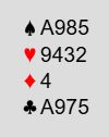Utgangen som står er 4 hjerter med kun syv trumf til sammen, og det er ikke lett å finne frem dit. I hjerterkontrakt kan ikke Ø/V få tatt mer enn to sparstikk og for kløver ess.