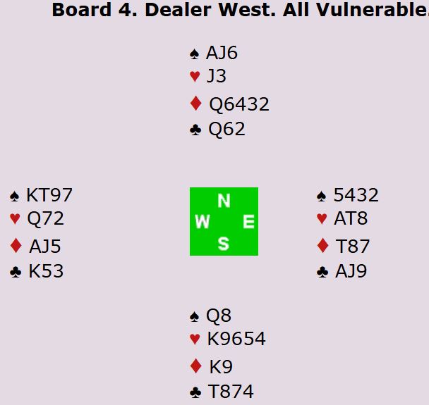Et enkelt spill beviser ikke mye om hva som er best, men i dette tilfellet kom godt over en tredel av N/S-parene i 3NT som gikk helt galt, og de fleste av dem gjorde det etter åpning 1 kløver. Av dem som åpnet med 1 ruter klarte flere å finne den fine delkontrakten i ruter hvor det ble ni eller ti stikk, andre spilte delkontrakt i spar. Ingen fikk høyere score enn +140 på N/S.
