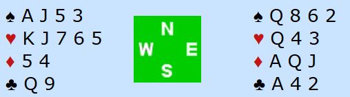 Det er N/S som har høyeste kontrakt her, og det er 4 hjerter. Mot hjerterkontrakt kan øst få en stjeling med kløverspill, men det går på bekostning av originalstikket i trumf. Et bedre forsøk for forsvaret er ruter 4 i utspill. For å vinne nå må spillefører fyke opp med ruter ess og ta A-K i trumf. Da ordner det seg fordi kløveren løser seg enkelt med en taper, og det blir kun en taper i trumf, en i ruter og en i kløver. Men om spillefører legger liten på den utspilte ruter 4 blir det bet i 4 hjerter (og kan bli flere bet hvis Ø/V klarer å krysstjele).