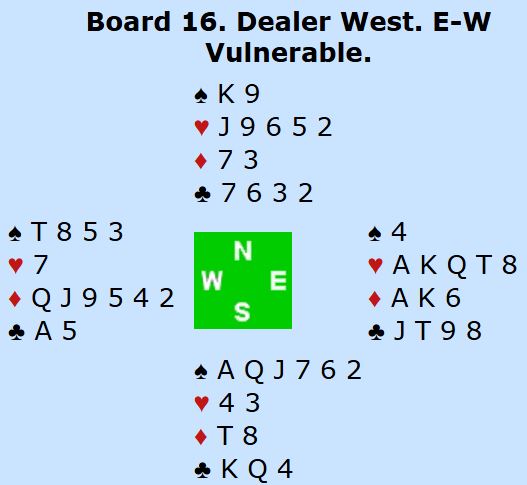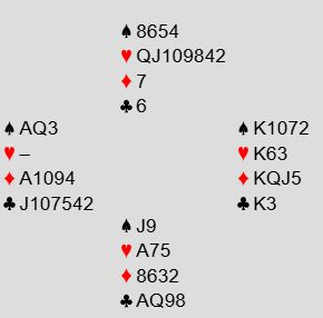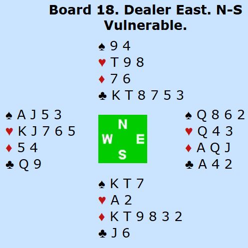 Ved det andre bordet nøyde nord seg med å hoppe inn med 2 hjerter, og syd var ved det bordet med og støttet hjerter via en utgangsinvitt. Ø/V fant etter hver rutertilpasningen og havnet i 5 ruter der også, men syd doblet sluttkontrakten.