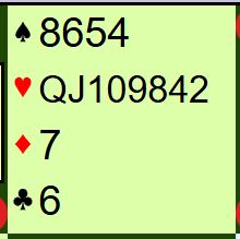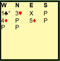 Ved det ene bordet hoppet nord til 3 hjerter over vest sin åpning 1 kløver, ved det andre nøyde nord seg med 2 hjerter. La oss si du sa 3 hjerter og meldingsforløpet utviklet seg slik: