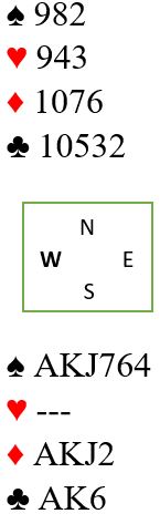 Den engelske spilleren på østs plass fikk spar konge ut fra Sivertsvik (syd). En måte å spille slemmen på er rett og slett spille hjerter for å godspille den fargen med stjeling(er) og håpe hjerteren ikke sitter 5-1. Hvis trumfen tas ut i to runder kan det bli trøbbel om syd har femkorts hjerter bak. Og om ruteren sitter 3-0 blir det også vanskelig om trumfen tas ut og hjerter ikke sitter 3-3 eller damen sitter dobbel. Men med 4-2 sits i hjerter går det fint nesten uansett om hjerter spilles tidlig. Spillefører var imidlertid litt redd for at en av dem kunne trumfe andre gang hjerter og ville gjerne forsøke å kombinere flere ting, kanskje få godspilt kløveren? Hun spilte kløver 7 i andre stikk. Syd kom på med toeren, og nord stakk over bordets kløver 8 med nieren. Så kom kløver 5 tilbake fra nord. Hva gjør du nå?