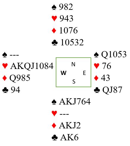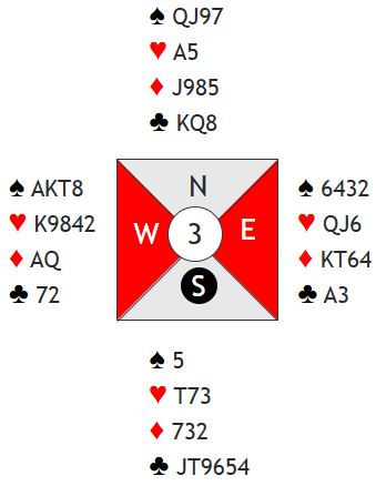 Vest vant første stikk for hjerter 9 og spilte hjerter tilbake til damen som ble lasjert. Så kom hjerter konge til esset. Vest med sin nitriste hånd hadde fått ett stikk allerede og satt nå og så ned på to hjerterstikk til!