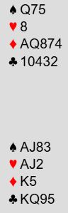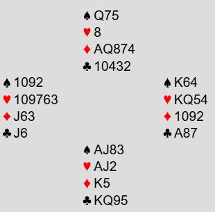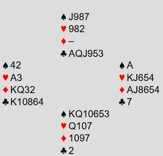 Over syds sterke, kunstige 2 kløveråpning hoppet vest innpå med 4 hjerter før syd ble spillefører i 4 spar. Fra vest kommer hjerter ess i utspill og syd trumfer. Det ser nokså rett frem ut, og spillefører legger ned spar ess i andre stikk. Da kaster vest en hjerter. Dermed er det ikke så rett frem likevel, for det må tilsynelatende bli to trumftapere til øst samt en taper i hver av minorfargene om ikke ruter dame sitter dobbel. Det kan jo også sitter Q-J dobbel i kløver. Og om øst har minst fire rutere er det bare å ta A-K og spille en tredje ruter, så trumfe den fjerde ruteren senere fulgt av trumffinesse slik at du slipper med en trumftaper. Er det en bedre sjanse enn disse mulighetene?