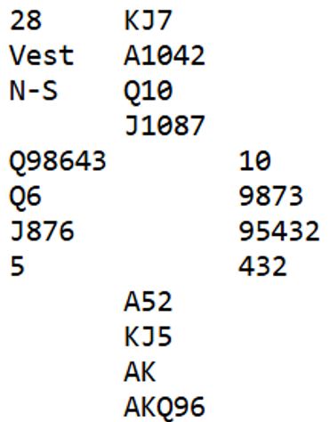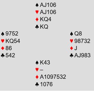 Alt er trist i dette spillet bortsett fra resultatet, +420. Utspillet ved begge bord er dårlig (men alle utspill kan jo være klaff), motspillene veldig svake, og skift til liten hjerter mot slutten er toppen på kransekaka. Øst bør se at han kan bli skviset, og hvis han spiller hjerter bør å spille damen være opplagt. Da holder vest hjerteren, og N/S går fortjent bet i den for hardt meldte utgangen.