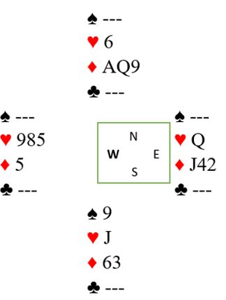 Spar ess vinner første stikk, så et par runder trumf, spar dame trumfes og tre runder ruter spilles (eliminasjon av sidefargene). Nå er det kun dette igjen: