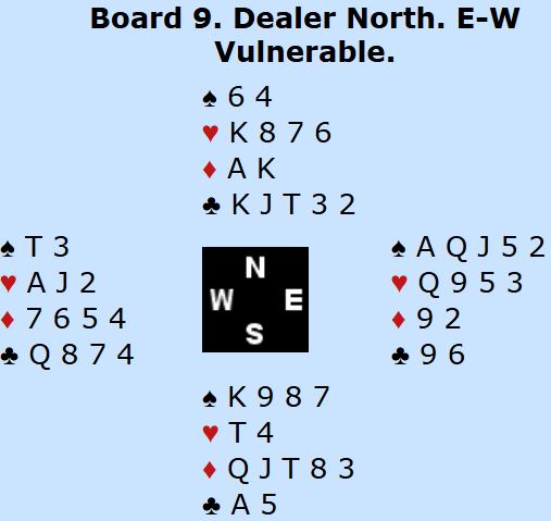 Dette er en hardmeldt, men ganske normal 3NT N/S som greit vinnes i praksis. Ved de fire bordene (finalen og kampen om 3.plassen) var kontrakten 3NT ved to av dem (+400) og ved ett bord spilte N/S 2NT med åtte stikk.