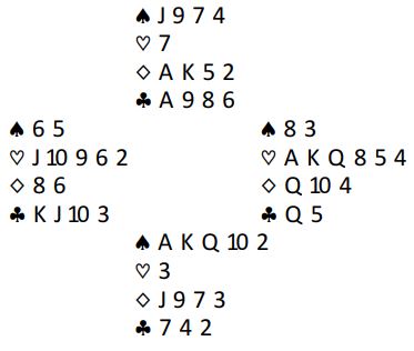 Syd havner i 4 spar etter at øst åpnet med 1 hjerter før syd meldte inn 1 spar. Vest sa 3 hjerter - sperr - og nord gikk rett i 4 spar. Nord har vel nesten til 4 hjerter - god 4 sparmelding - men mangler kanskje noen poeng for den meldingen etter kun en innmelding fra syd. Uansett, 4 spar er kontrakten, og vest spiller ut hjerter knekt. Om vest vinner det stikket eller om øst stikker over knekten skjer det samme, det kommer trumf tilbake i andre stikk. Spilleplan?