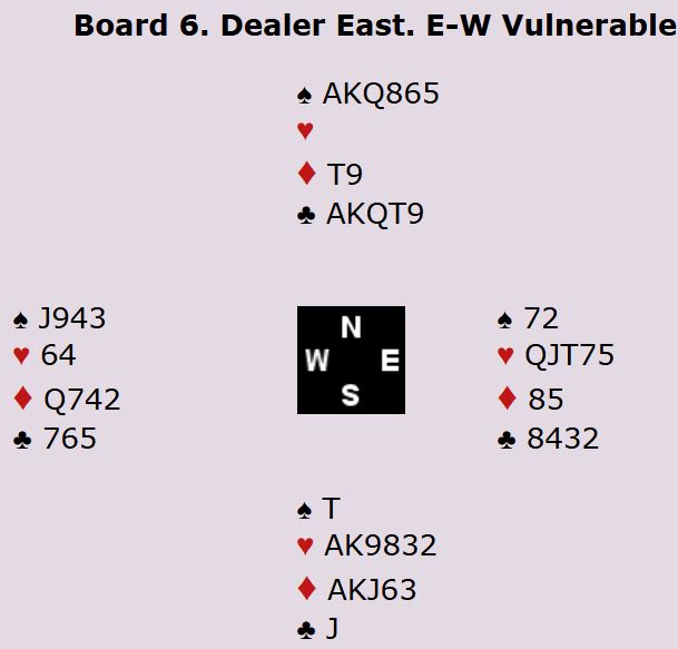 Dennis Bilde og Martin Schaltz satt N/S og fikk utlevert disse monsterkortene. Det er umulig å vite finne ut med sikkerhet hva som skal spilles, men på et tidspunkt i meldingsforløpet hoppet Bilde (nord) til 7 kløver og ga Schaltz valget mellom 7 kløver og 7 spar. Schaltz passet og de var havnet i en sjelden storslem med 5-1 i trumf! Den står enkelt om det kommer alt annet enn trumf ut siden en spar kan stjeles med den single trumfknekten, og nords hånd har deretter bare ståstikk bortsett fra to små ruter som syds ruter A-K dekkler opp.