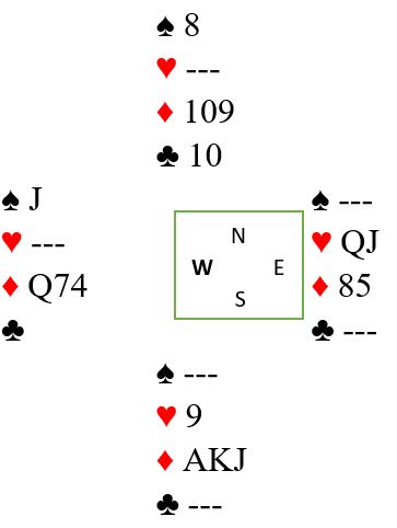 Så kom kløver 10. Så lenge øst har fem hjertere og vest fire spar er det slik at ruteren faktisk er nødt til sitte 2-2 til slutt med tre kort igjen, vest må holde en spar og øst en hjerter. Dobbelskvis fungerer perfekt, men spillefører viste jo ikke med sikkerhet at øst hadde femkorts hjerter. Startet han med fire hjertere kunne han hatt ruter dame tredje i trekorts-posisjonen. I så fall må ruterfinesse prøves.