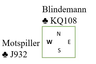 Det spilles liten kløver mot bordet. Om vest legger liten vinnes med kongen, så spilles garantert liten tilbake til syds ess. For det er nå kun en 4-1 sits spillefører kan løse. Om øst har J-9 fjerde har han sikkert stikk uansett. Idet liten spilles fra nord i andre trumfrunde følger ikke øst farge. En markert finesse med tieren tas i fargens tredje runde. Fargen så altså slik ut fra start: