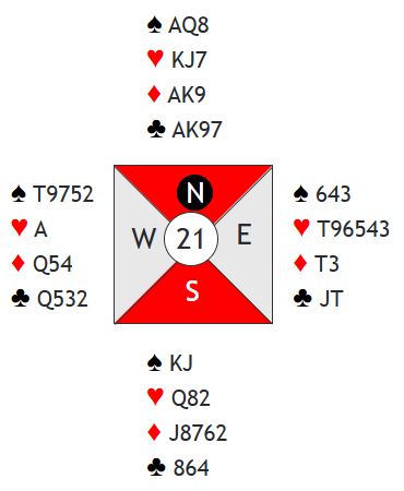 Som du kan se har N/S syv ruterstikk og to ess i motspill. Hvis de hadde fått tak i stikkene sine ville det blitt fem doblede bet, +1100 til N/S. I så fall ville Danmark tapt spillet med 10 IMP.