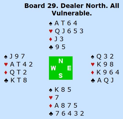 Omtrent halvparten av N/S-parene spilte hjerterkontrakt, og ingen fikk åtte stikk. Noen fikk ni, andre ti stikk. Toppen N/S gikk til Linn Beate Tollefsen - Erlend Hanssen som noterte den sjeldne scoren +880 for 4 hjerter redoblet (!) med ti stikk. Fire par hadde +590 som N/S for 4 hjerter doblet med hjemgang, og tre par til vant 4 hjerter udoblet. Noen var i 5 hjerter. Bla. satt vinnerparet imot 5 hjerter som endte med to bet (Ø/V +100). Det ga +2 til Ø/V.