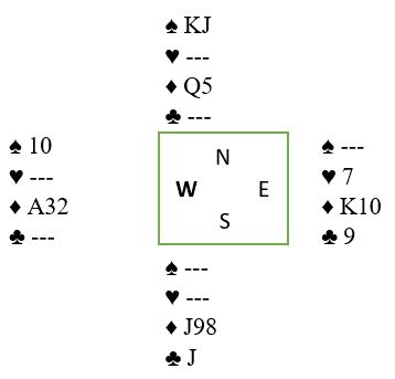 Det som skjedde må for spillefører ha føltes som om han ikke spilte bridge, men hadde feberfantasier. For hvordan gikk det an at sparfargen satt sånn fordelt? Han som gikk bet i 6 hjerter i andre stikk på en så absurd måte så selvsagt med det samme at han burde sagt "stjel med sekseren" som er helt gratis. Hvis syd følger med spar bak spiller det vel ingen rolle om man «ofrer» hjerter 6 i stedet for hjerter 2! Om han hadde vunnet med hjerter 6 i stikk 2 ville dette skjedd videre: Etter å ha tenkt oppps...syd hadde ikke flere spar, men kunne ikke stjele over (!) tas tas trumfen ut, kløveren prøves men gir kun tre stikk, så resten av trumfene. Før den siste ser det slik ut: