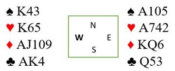 Først telles de sikre stikkene, og det er 2+2+4+3=11. Det tolvte kan komme ved at hjerteren sitter 3-3. Det er også en liten sjanse for at sparfargen kan gi tre stikk (for eksempel Q-J dobbel). Hovedsjansen er imidlertid at det blir tre hjerterstikk. Ett hjerterstikk må gis bort. Hvis det spilles A-K i hjerter og nok en hjerter går det bra om fargen faktisk sitter 3-3. Men om hjerteren sitter 4-2 kan motstanderen med fire hjertere ta beten med det samme. Så i dette spillet bør det dukkes en hjerter, dvs. liten hjerter fra begge hender.