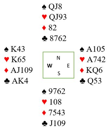 Spillefører gir altså bort ett hjerterstikk med liten fra begge hender. Så kommer han inn igjen, og da kan det ventes med sparhonnnørene, men det går også an å ta A-K i spar for oversiktens skyld (og da kan du claime 12 stikk om dame knekt faktisk sitter dobbel). En sparhonnør fra nord kommer på i andre sparrunde. Så tas tre runder kløver fulgt av ruterstikkene. Før den siste ruteren innkasseres ser det etter denne utviklingen slik ut: