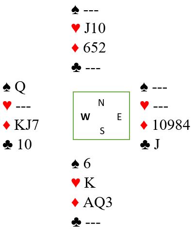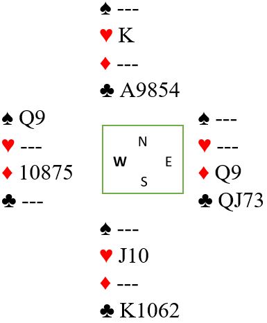 Ruter dame kom i utspill ved de fleste bordene. Spillefører får etter hvert trumfet sin tredje ruter hos vest. Det er jo tre toppstikk i kløver siden damen faller under kongen (eller esset), og nord blir med riktig timing utsatt for en skvis. Forskjellige sluttposisjoner kan oppstå, og det kan spesielt interesserte pusle litt med selv. For eksempel kan vi se på en mulig sluttposs uten at spillefører har gjort noe annet enn å trumfe den nevnte ruteren med trumf hos øst, og tatt ut trumfen. I det diagrammet her har også spillefører tatt for kløver konge, og dette blir igjen: