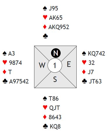 Nord åpner med 1 ruter, og syd svarer 1NT. Nå kan det meldes "korrekt" med nord sine kort, for eksempel reversere med 2 hjerter for å kunne finne beste konrtakt som ikke behøver være 3NT. Men å si 3NT direkte er vel ikke så galt det heller? Husk syd har ofte noe i kløver (og lengde) siden han ikke hadde majorfarge å melde som svar på 1 ruter.