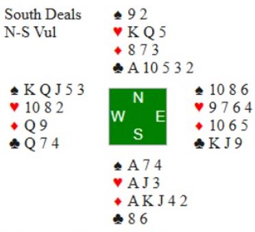 Vest spilte ut spar konge som ble lasjert, så mer spar som også ble lasjert før en tredje runde spar gikk til syds ess. Øst fulgte farge tre ganger, så øst hadde temmelig sikkert startet med spartieren tredje.