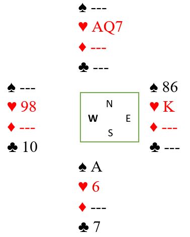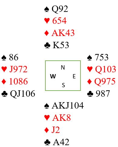 Spillet går slik: utspillet stikkes, ruter til syd, hjerterfinesse som ryker til øst. Kløver tibake, og to kløvertstikk til avslører sitsen i den fargen. Så ruterstikkene med avkast av en hjerter fra syd. Vest som startet med dobbelton ruter kaster to kort og kvitter seg med en hjerter og en spar. Så spilles tre runder spar. Før den siste sparen er det tre kort igjen. Syd har spar ess, en hjerter og en kløver. Vest har en kløver og to hjertere. På spar konge MÅ vest kaste seg ned på kun en hjerter. Dermed har han altså singel hjerteri gjen sånn at om vest har hjerter konge kommer den på i tokortspossen! Du spiller hjerter mot ess-dame, og vest følger med nieren. Å ta finessen nå er «hull i hodet». Vest kan ikke ha kongen, han har jo en kløver igjen. Så du forlanger esset og får bonus om det satt sånn fra start: