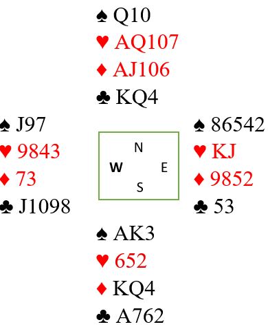 Og den bitte lille ekstra sjansen: 3. Siden vest viste seg å ha kløverstopper og ingen hjerterhonnør vinnes det med rett spilleføring om sitter som i diagrammet, dvs. øst har konge-knekt dobbel i hjerter.