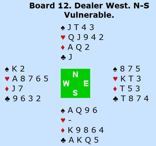 Litt under halvparten av N/S-parene fant frem til 6 spar. Det skjedde stort sett etter pass fra vest, og så ved de fleste bordene åpning med 1 hjerter fra nord. Noen steder gikk det imidlertid pass fra både vest og nord, og da ble det vanskeligere for N/S å finne slemmen. Men der nord åpnet fikk N/S melde i fred, og ved de bordene nord åpnet med 1 hjerter ble syd naturlig nok svært sleminteressert idet 4-4 tilpasningen i spar ble funnet.