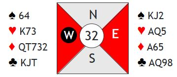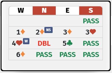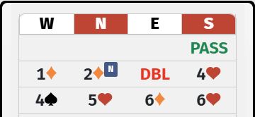 Nå spørs det om du melder noe mer med vests kort eller velger å spille motspill mot 6 hjerter? N/S har meldt 6 hjerter i ugunstig, så det kan være et helt crazy spill hvor det er enormt mange stikk i begge retninger. Nords 2 ruter viste begge major (Michaels). Makker har altså meldt 6 ruter over deres 5 hjerter, men syd ga seg ikke og sier 6 hjerter. Hva tenker du om dette, og hva melder du?
