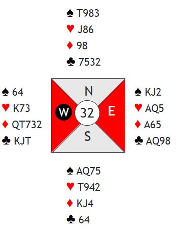 Vi tar met et spill fra den turneringen, og det illusterer godt hvordan veldig små marginer kan avgjøre stor forskjell i score i parturnering. I dette spillet ble det meldt utgang ved samtlige bord. Ingen gikk bet, men det ble elendig spill for noen, gladspill for andre. Dette spillet ville gått raskt i glemmeboken om det hadde dreid seg om lagkamp.
