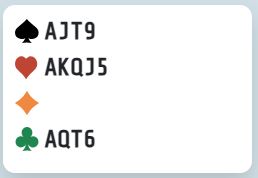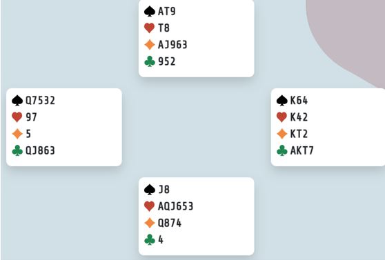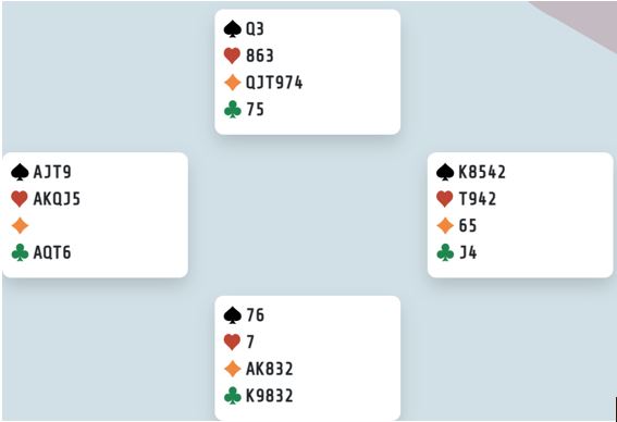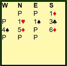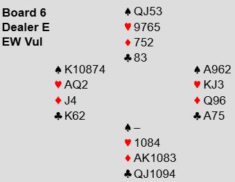 Paret som hadde den nevnte misforståelsen lot seg ikke vippe av pinnen av den grunn. Noen få spill senere meldte de slem igjen. Gode vurderinger førte til den fine lilleslemmen 6 ruter med kun 27 HP til sammen. Det stod riktignok i 7 ruter, men det var pga. helt perfekte kort mot hverandre: