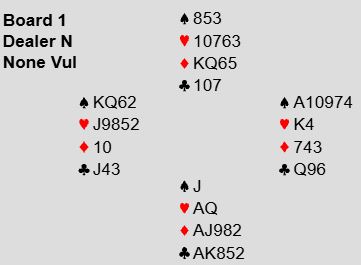 Ved det andre bordet meldte også syd inn 1 ruter med kort som kanskje enkelte ville sagt 2NT med (?) – begge minor. Men ved det bordet svarte vest 1 spar som naturlig melding. Dermed kom til slutt 4 spar (udoblet) på vest sin hånd ved det bordet, etter at syd også der fikk meldt 3 kløver i andre melderunde. Det ble altså nord som skulle spille ut der, og med en makker som hadde vist begge minorfargene ble det naturlig å prøve kløverutspill fra dobbelton. Da var det forsvaret som var ett stepp foran, og de rakk å godspille kløverstikk i tide - betestikket. Med +100 ved det bordet vant NORDNORSK MIX 14 IMP.