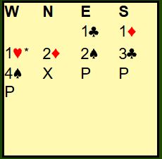 Ved det andre bordet åpnet DE BOTTON sin syd også med 1 ruter, og vest doblet. Ved det bordet sperret nord med 4 ruter. Øst passet, og syd sa 5ruter. Vest var altså omtrent i samme situasjon ved begge bord. Hva bør de melde?