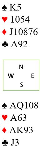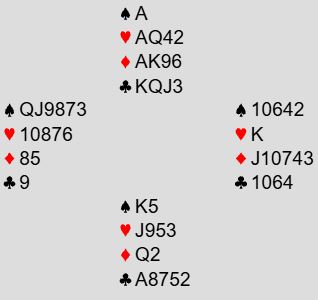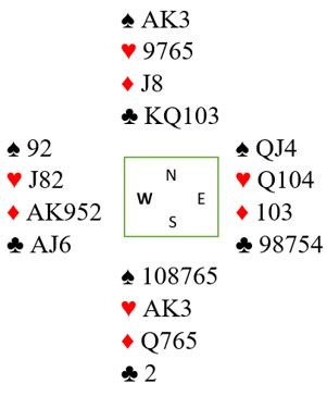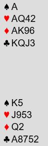 Nord skal altså spille 6 hjerter som er en bra kontrakt. Problemet er at det kan bli to hjertertapere, så det er faktisk bedre i grand- eller kløverkontrakt hvor det behøves kun to hjerterstikk for å å komme til 12 (2+2+3+5=12). Hva gjør du etter ruter knekt ut fra øst mot 6 hjerter?