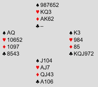 Nord føler seg selvsagt robbet. Det må meldes selv om det selvsagt noen ganger kan bli feil. Å doble kan kanskje ha noe for seg også i den situasjonen, men poenget med at syd kanskje kan straffepasse er ikke så sannsynlig lenger siden vest støttet kløveren. Og om det dobles må nord passe på en eventuell 4 hjertermelding fra syd, og det kan bli helt grusomt om syd for eksempel har kun firekorts hjerterfarge og sparstøtte. Det kan imdilertid bli feil å si 4 spar også om syd har for eksempel singel spar og lang hjerter- eller ruterfarge...