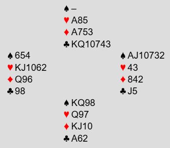 Mot Bård Kåre Græsli dekket ikke syd hjerter dame, og da er det ikke fullt så enkelt. Men Bård Kåre så hva som skulle til. Han tenkte det var sannsynlig at nord hadde kløverlengden. Så for at en skvis for det tolvte stikket skal kunne fungere må hjerterholdet overføres til nord. Etter hjerter dame hadde fått seile rundt spilte han derfor hjerter knekt! Den måtte syd dekke, hvis ikke er det tolv enkle. Så da den andre store hjerteren fra øst ble dekket og esset vant stikket var hjerter 8 den nest høyeste hjerteren. Da var det bare å innkassere sparstikkene fulgt av ruterstikkene. Idet den siste ruteren ble spilt så det slik ut: