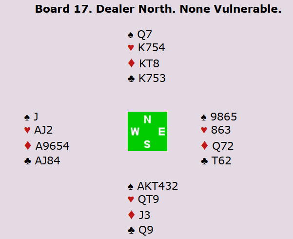 For veteranene spilte Peter hjem 4 spar på syds hånd. For å vinne den litt hardmeldte utgangen må man gjøre riktig i ruter og finne hjerter knekt. Ved det andre bordet fikk øst-vest spille 3 kløver med to beit, og dermed ble det 8 IMP til Norge. I åpen klasse stoppet Boye og Espen i 3 spar med ti stikk, men det ble likevel stor gevinst til Norge da Allan og Terje fikk spille 2 ruter doblet med overstikk øst-vest! Dobbeltscore er alltid fint.