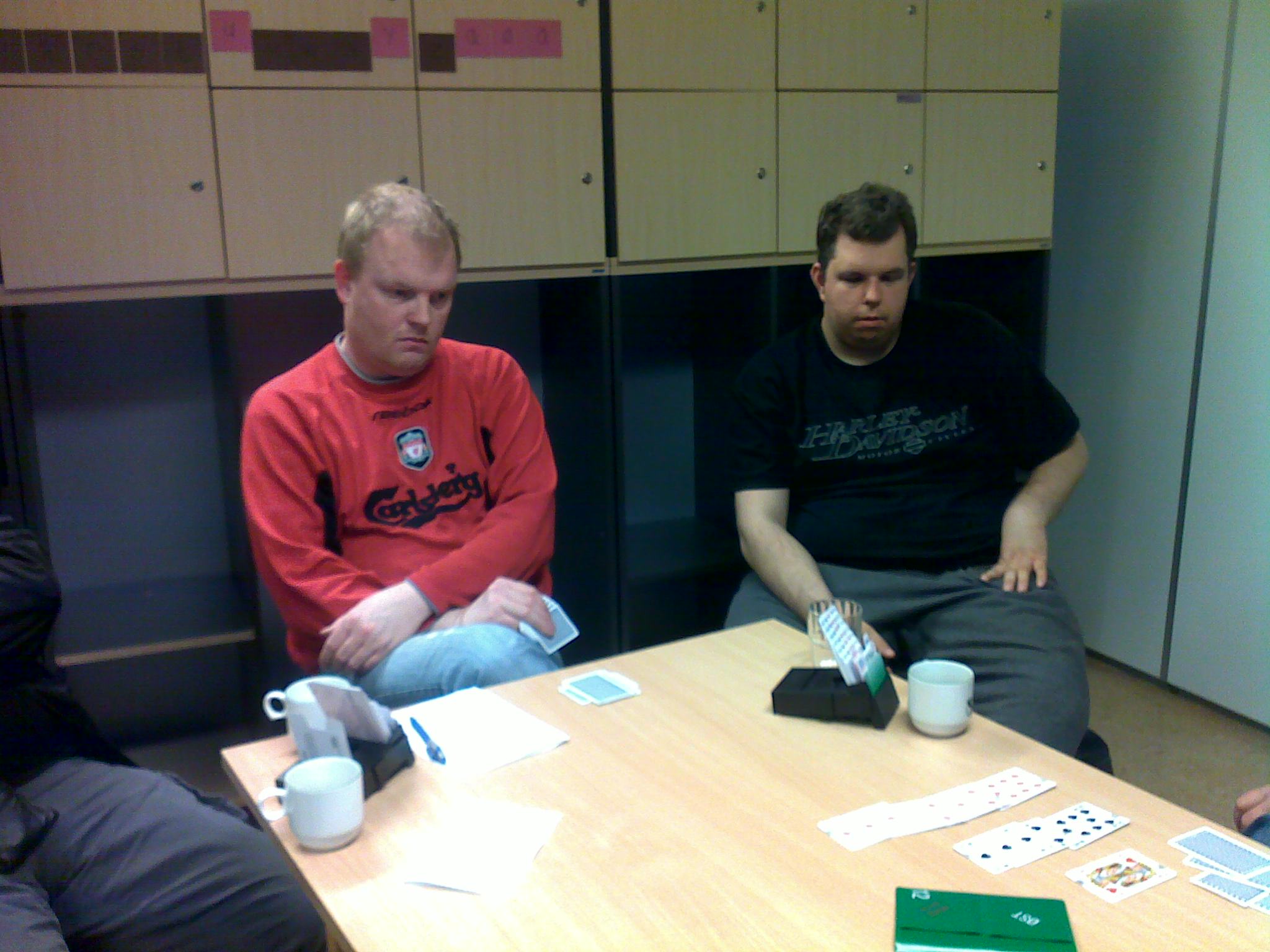 Våre helter i Namsos klarte prøven og slo ut Kristiansand i 6. runde. De er dermed klar for finalen! En konsentrert Ragnar og en håpefull Jørn studerer blindemann Kampen mellom Namsos og Kristiansand ble utsatt pga askeproblemene fra Island, men ble spilt innen fristen satt av NBF. Namsos var vel favoritter hos de fleste, men alle lag som har kommet så langt er gode. Kampen var lenge jevn men Namsos vant ca 40 IMP på de siste 6 spillene i første halvrunde. Andre halvrunde var også jevn og sluttresultatet ble til slutt 100 - 63 til hjemmelaget! Rapportene sier at det var slemsvingene som gikk i Namsos sin favør. Finalen går i Ålesund fra 13-16 mai (les mer her) Namsos er etter mange eksperter blandt favorittene til å vinne NM i år, så vi håper mange følger med på BBO og turneringens hjemmeside! Vi gratulerer Ragnar Davidsen, Per Arne Flått, Frode Nybo, Geir Enge, Gunnar Øvereng og Jørn Arild Ringseth med finaleplass og gleder oss til å følge med! Glade gutter!