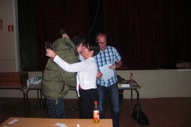 Gunn Tove Vist og Christer Kristoffersen ble i dag kretsmestere i KM mix. 28 par hadde meldt seg på turneringen som ble holdt på Frosta. LINK TIL RESULTATET Glade medaljevinnere (fra v: Allan (Steven) Livgård, Bodil Nyheim Øigarden, Christer Kristoffersen, Gunn Tove Vist, Tove Stoen og Ragnar Davidsen) To nybakte norgesmestere (Håkon Kippe og Karl Morten Lunna) måtte se seg slått i årets KM Espen måtte gi seg og gi mor en klem etter at de fikk premie Som vanlig i mixturneringer var det meget god stemning i turneringa. Ingen sure miner når bridgematene ikke ville samarbeide et par runder. Vi takker Frosta for at de tok på seg å arrangere turneringa. Bra og rimelig servering og luftige lokaler gjorde at det ble en fin ramme rundt turneringa Vi gratulerer medaljevinnerne og håper enda fler vil ta seg turen til KM mix neste år