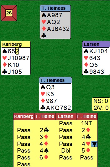 Den siste kampen var også tett og god fra gunnsmoke sin side og her er det siste og avgjørende spillet i kampen. Det var superjevnt i kampen om seieren mot Underberg, men +1370 var nok til å vinne tilstrekkelig. Det kom spar ut, men det var nok avkast til å bli kvitt de tre sparen og siden trumfen oppførte seg eksemplarisk ble det vunnet kontrakt. Hadde ikke Tor løfta 5ru til 6ru ville Underberg vunnet turneringa!!