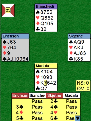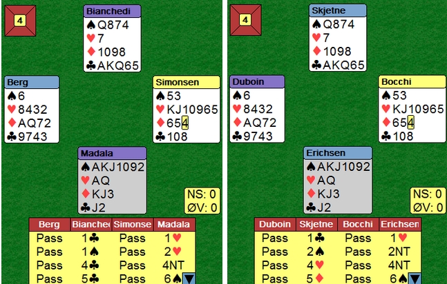 Det italienske laget var rett og slett bedre enn de norske i den BBO viste 32 spillskampen i kvartfinalen. Gode lag er heldige og når de norske i tillegg gjorde et par dyre feil ble det seier 69-29 til Lavazza. Lag Erichsen skulle gjort VELDIG mye rett for å ta igjen de 40 IMP'ene. I skrivende stund er ikke resultatet fra DeButton sin kamp lagt ut, men du finner det sikkert her i løpet av kvelden.