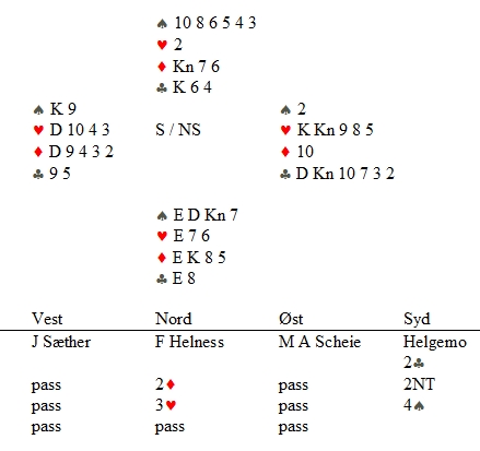 Tredje og åttendeplass i Sør-Afrika Erichsen mot Lavazza i kvartfinalen i Spring Four. Alle fire norske er med i SpringFour enda. En aldri så liten overraskelse i lagturneringa når "OPP OG NED" leda fra start til mål. Gratulerer til Stein Bjerkset - Asgeir Langen og Ola Melå - Pål Nilsgård. Landslaget og landslagstroppen med Kvangraven - Lie - Livgård og Terje Aa spurta bra og ble andre. Lag Høyland på tredje. Det er ingenting som er mer gledelig enn at ungdommen overtar hegemoniet i bridge. Når jentene i tillegg melder seg på og vinner de største og tøffeste parturneringene våre, er det kjempebra. I Trondheim var det over 50% guttunger (og ei jente på toppen) blant de ti beste. Det liker vi!! Geir Helgemo var spillefører, mens Marcus Scheie måtte bare innse at denne gangen var