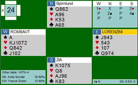Fredrik Bjørnlund (SWE)leverte på Island i 2012 et av de fineste spillene jeg har sett. Det er svensken Fredrik Bjørnlund som er i førersetet og i ett spill henter han fram det ene coupet etter det andre. I tillegg benyttet han seg av informasjonen vest sin åpning ga. Hold deg fast!!