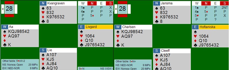 Jeg undrer meg også litt over 5hj fra Thomas. Det er i alle fall superaggressivt for å vinne en kontrakt på 5-trinnet og er rett bare når makker har fem hjerter, til nød fire selv om trumfmatten lyser i mot selv på 4-4. Noen sier at Hoffa skulle preferert på renons i spar fordi makker har MYE lenger spar enn hjerter etter dette meldingsforløpet. Det er skrivebordsbridge.