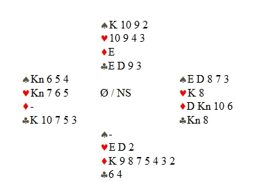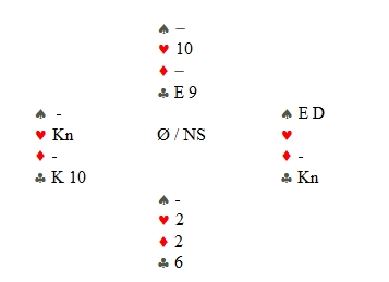 Så ruter konge og mer ruter til øst. Heldigvis for Helge hadde ikke han mer hjerter og øst fridde seg med kløver knekt til bordets dame. Hjem på en sparstjeling og alle trumfene unntatt en:
