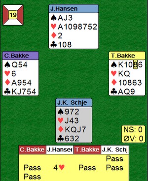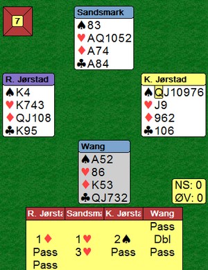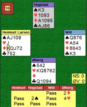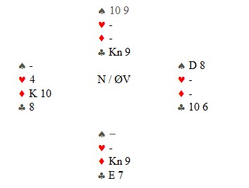 Glenn spiller ut hjerter 2 og finner makkers farge. Syd stikker og bommer ruteren, noe som ser naturlig ut. Mer hjerter som syd vinner. Han tar tre ruterstikk og spille kløver til knekten. På de to ruterne, kasta Lars Arthur to kløvere og har med det latt makker i stikken med holdet i begge svartfargene. Det kunne vært kritisk, men ikke når du har sånn oversikt som nordlendingen. I posisjonen over til høyre, tar han for hjerter 10, men IKKE hjerter knekt !!