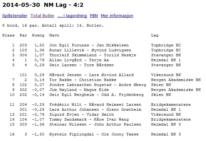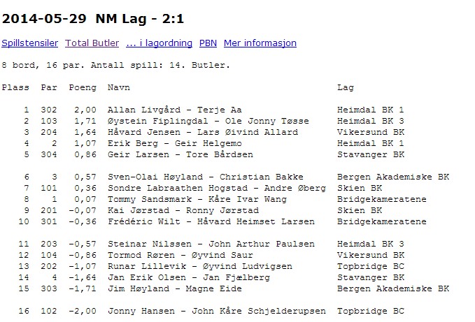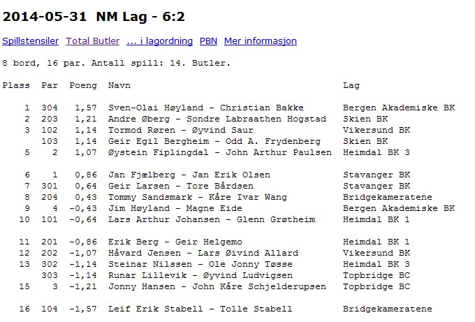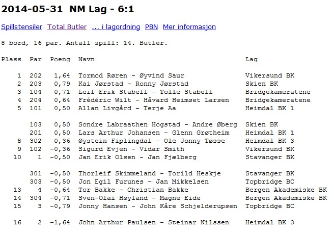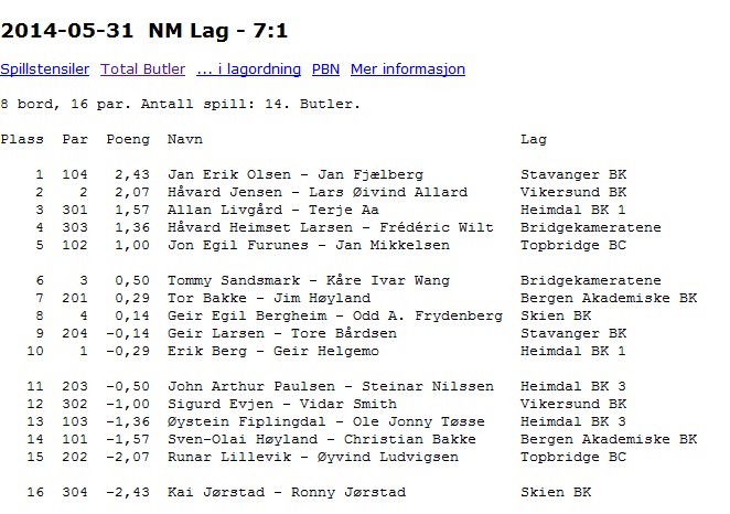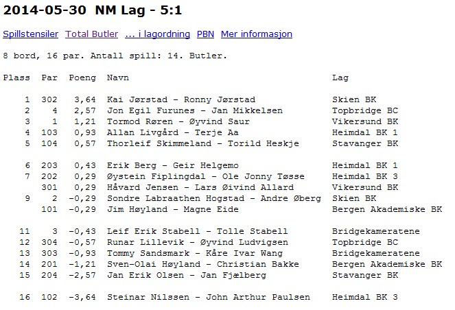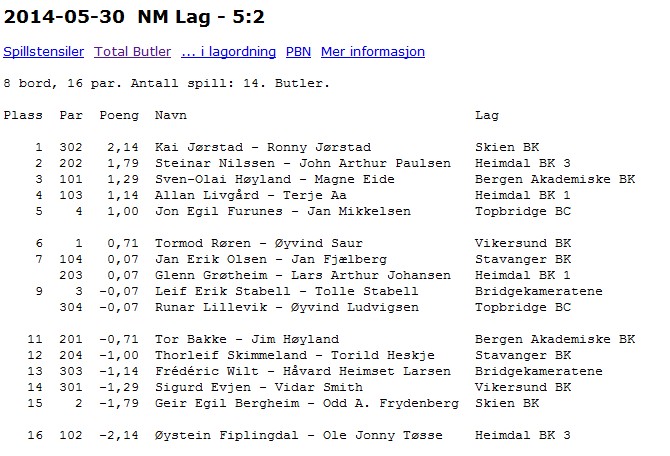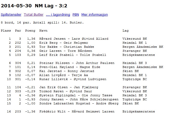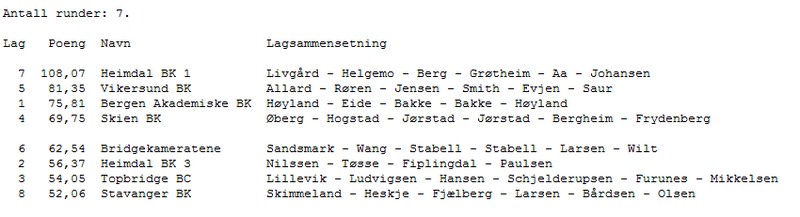 Her gjettet Geir Helgemo rett når han løftet til 7hj etter en laaaaannng tenkepause. Jeg var en stund inne på tanken å kritisere han for å gamble på en storeslem når han allerede har vunnet turneringa . I en serieturnering påvirker alle resultater de andre sine sjanser til gode plasseringer, så det er viktig at lagene fortsetter å gjøre det de ellers ville gjort. Dette gjelder like mye i toppen som i bunnen. Ingenting irriterer mer i en parturnering som at par som har falt av lasset spar ut poeng fordi de ikke bryr seg lenger.