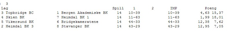 Andre halvrunde starter forsiktig med mange flate spill. I spill 18 levere Allan og Terje et flott motspill mot 3NT og beiter der det blir elleve stikk på det andre bordet. Kampen mellom Heimdal og Vikersund ebber ut uten de store spillene og ender 13.82 - 6.18 til trønderne. BAK ligger på andreplass og de vant nøyaktig med samme sifre.