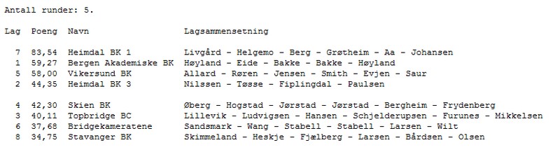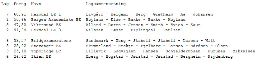 Denne gangen var det Topbridge og Bergen Akademisk som ble vist på BBO. Bergenserne ligger på middels etter to kamper, mens Topbridge har fått en tung start. BAK vant fint i første kamp, men fikk juling av Heimdal 1 i andre.