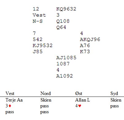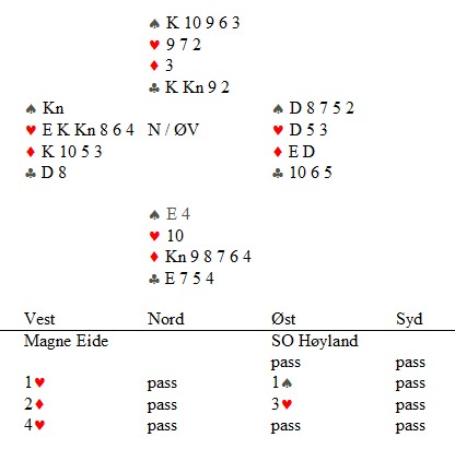 Ruter konge ut ble lasjert. Skift til hjerter dame (!). Vidar stakk med esset på hånda og tok kløverkappen til singel konge. Ruter som han måtte ligge unna. Allan vant og spilte hjerter. Den slapp han og forvente at tieren skulle ta stikket.