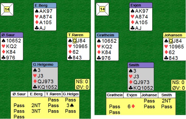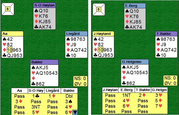 Det hele startet med to slemmer i spill 1 og spill 2. Det første gikk omtrent likt ved begge bord og jeg kan ikke se hvordan det går an å finne ut at det står storeslem i spillet. Denne gangen hadde makker EK i kløver og ingenting i ruter. Neste gang er de motstatt og 6hj er beit.